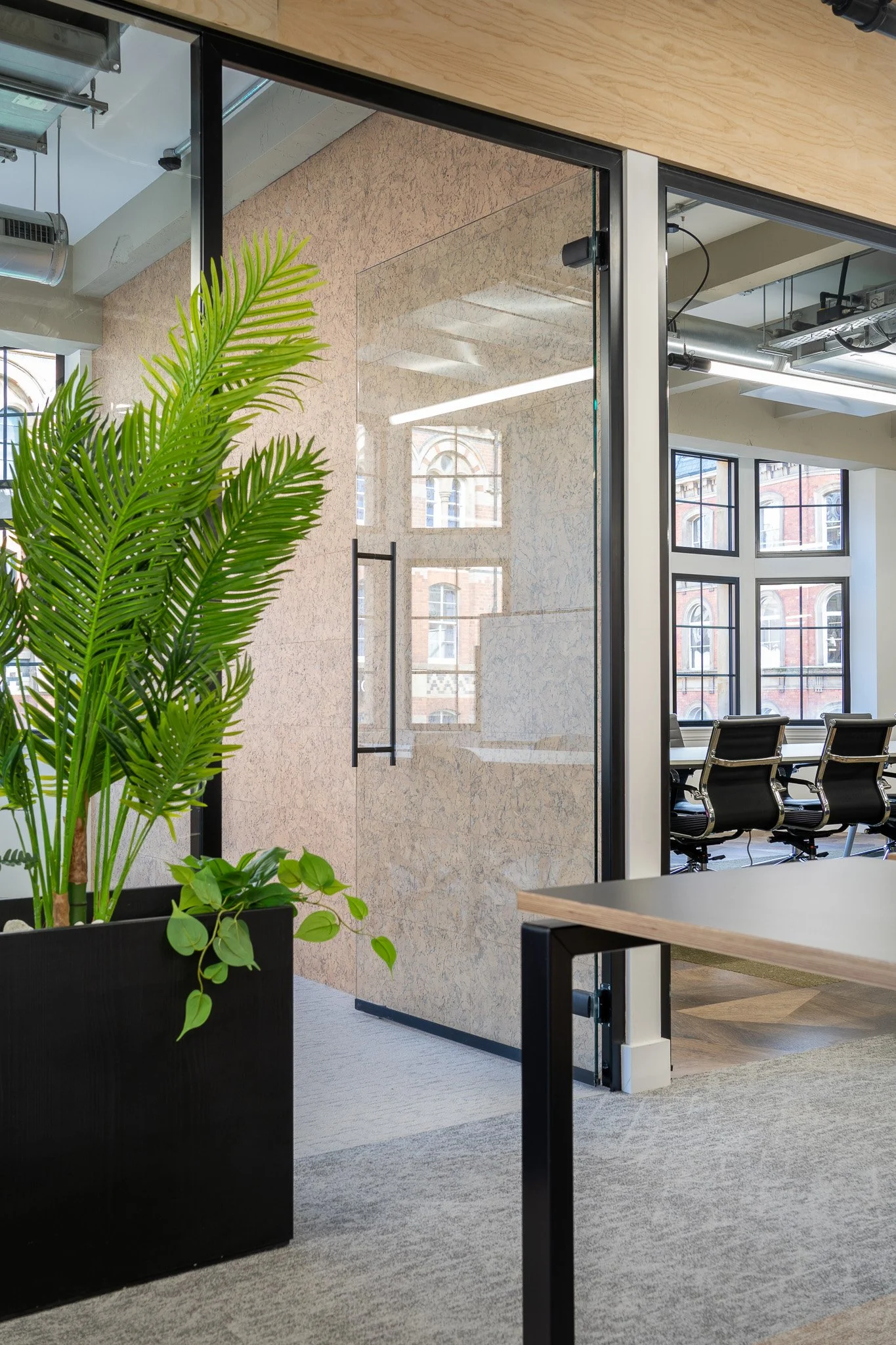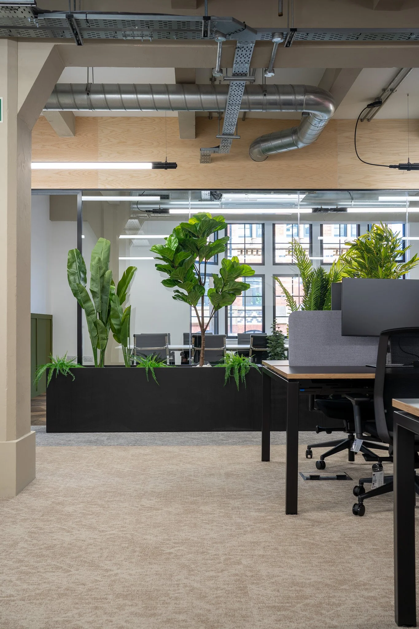 The brief called for a space that focused more on workstations and meeting areas than on breakout spaces, reflecting the dynamic growth of the company. To achieve this, we embraced a neutral color palette, creating a soothing and focused environment that fosters productivity and creativity. Thoughtfully placed planting adds a natural element, promoting well-being and balance within the workspace.